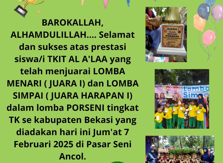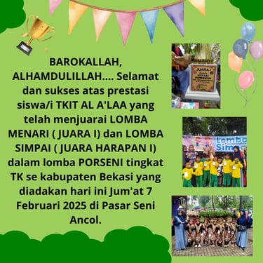 BAROKALLAH, ALHAMDULILLAH.... Selamat dan sukses atas prestasi siswa/i TKIT AL A'LAA yang telah menjuarai LOMBA MENARI ( JUARA I) dan LOMBA SIMPAI ( JUARA HARAPAN I) dalam lomba PORSENI tingkat TK se kabupaten Bekasi yang diadakan hari ini Jum'at 7 Februari 2025 di Pasar Seni Ancol.
